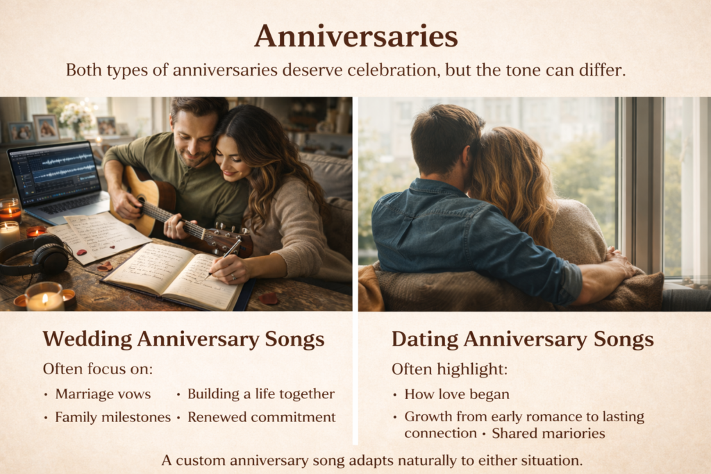 This guide explores how personalized anniversary songs and romantic love songs are used to celebrate relationships at every stage — from first anniversaries to decades together.