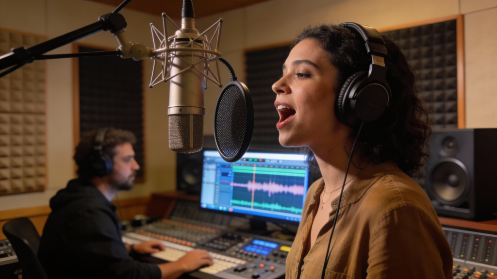 A cozy, intimate music studio filled with instruments, like a grand piano, guitar, and a variety of microphones. In the foreground, a couple shares a moment of creativity, surrounded by sheets of music and a laptop displaying a waveform editor. The woman, dressed in casual but professional attire, sings passionately into a microphone, while the man, wearing a smart-casual outfit, plays the guitar, his face lit with inspiration. In the middle, a mood board with song lyrics and photographs illustrating their journey together. The background features warm lighting that creates a magical atmosphere, emphasizing the uniqueness of custom songs. The scene embodies a sense of connection and creativity, reflecting the personalized music creation process from SongGifted.com, capturing the essence of love and artistry.
