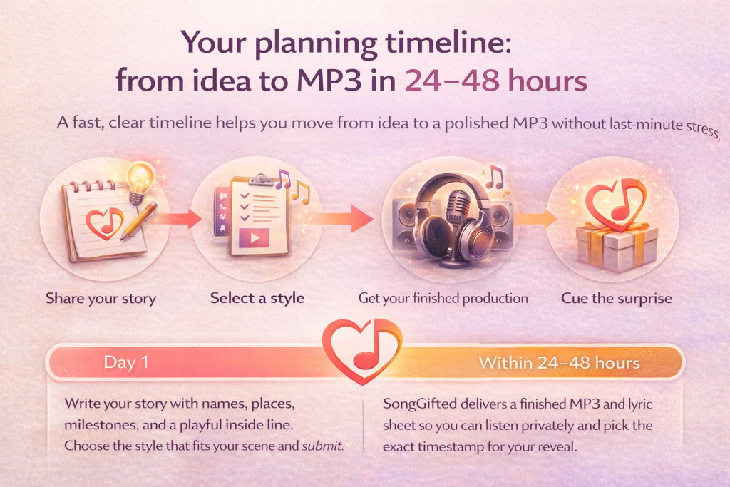 Within 24–48 hours: SongGifted delivers a finished MP3 and lyric sheet so you can listen privately and pick the exact timestamp for your reveal.